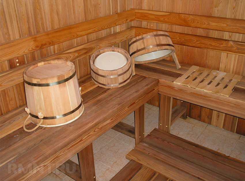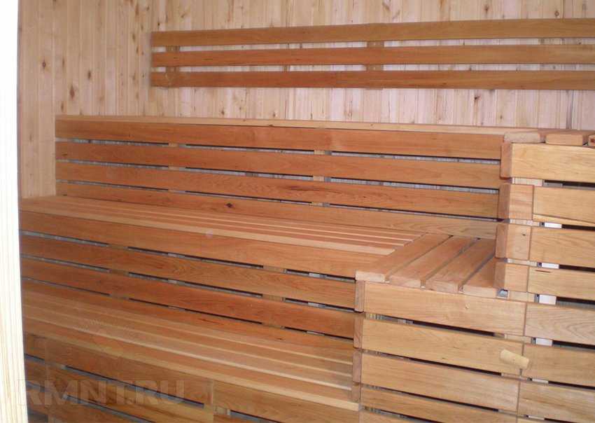 Материалом для полок служит липа, сосна, тополь или осина. Минимальная длина полков — 1800 мм, ширина — 500–800 мм. Дистанция между «этажами» двухрядных полков должна составить не менее 350 мм, минимальная дистанция от второго ряда до потолочного покрытия — 1100 мм.