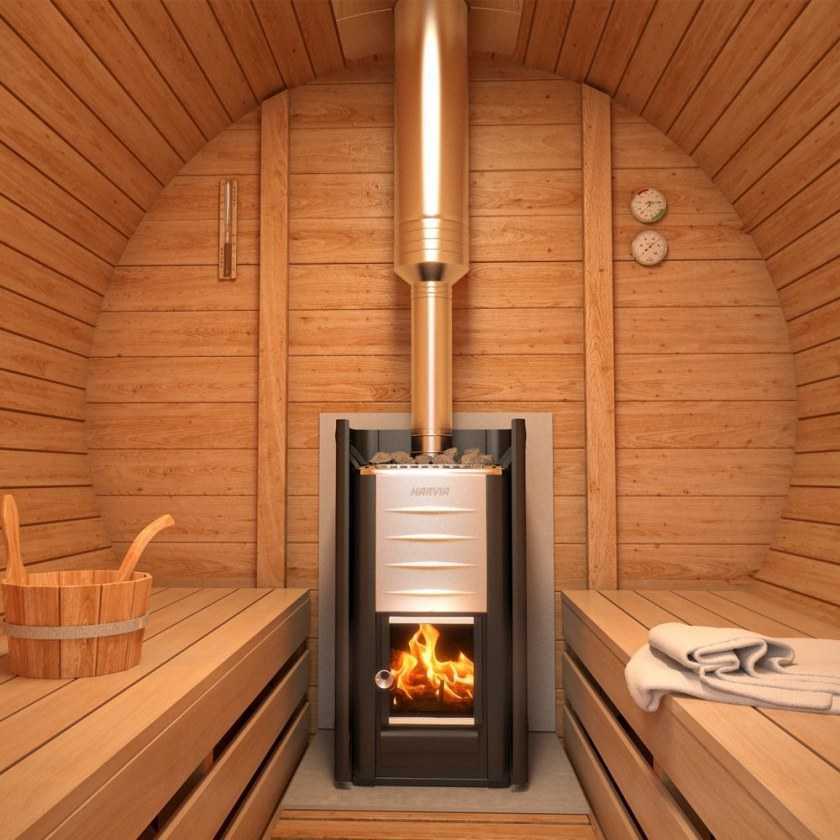 Внутри должно быть комфортно и максимально свободно. В парной лучше всего установить легкую электрическую печь из стали, т. к. кирпичные и чугунные модели слишком массивные.
