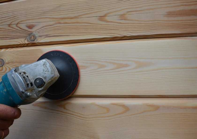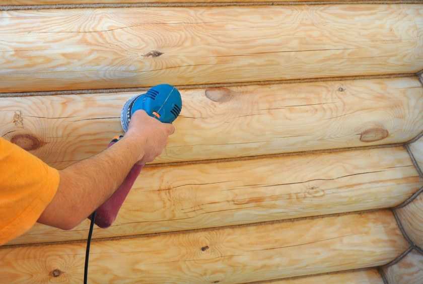 Начинают с самой простой и небольшой стены. Стоит повозиться с углами, там круг болгарки не везде достает, придется поработать стамеской. Торцы обрабатывают в конце, их запечатывают мастикой. Удобно брать белый цвет, на него легче ляжет покраска. Шлифовка позволяет показать красивую структуру дерева, натуральный узор.