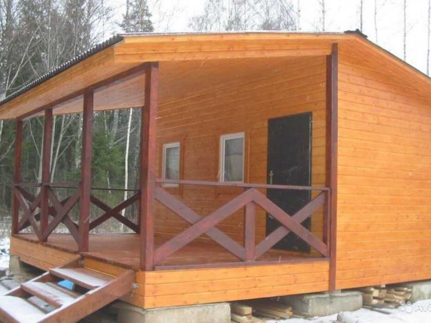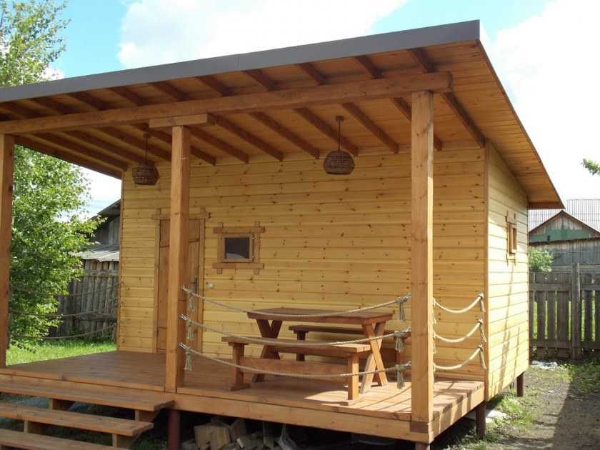 Каркасная баня может быть оборудована террасой для посиделок в теплое время года