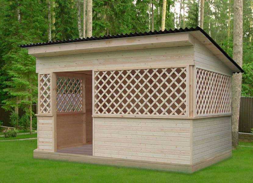Размер определяется на основании того, каким образом будет использоваться летняя зона отдыха и сколько места возможно выделить на участке под ее установку. Можно поставить совсем небольшую конструкцию для семейных посиделок или огромный павильон, в котором легко разместится большая компания. Но самым оптимальным вариантом, по мнению большинства домовладельцев, является односкатная беседка 3х4, проект которой несложно найти на сайте какой-либо строительной компании.