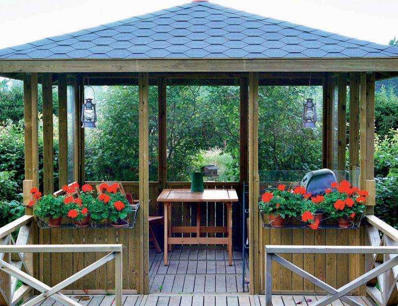 Шифер довольно устарел, если только речь идет не о еврошифере. Однако последний лучше использовать в больших объемах для больших конструкций. Ондулин хорош для современных и открытых беседок. Остальные конструкции лучше крыть черепицей.