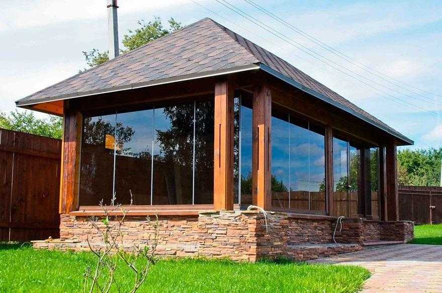 Различных вариантов создания таких конструкций достаточно много. Можно сделать из кирпича или бруса и застеклить, а можно ту часть, где находится мангал сделать из камня, а гостиную из дерева.