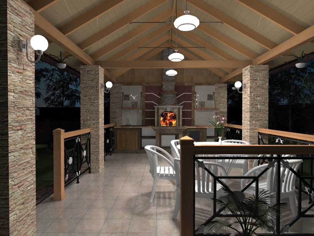 Полуоткрытая беседка с камином станет чудным местом для вечернего отдыха летом. Сочетание дерева и кирпича позволяет сохранить баланс между легкостью и основательностью конструкции. Вопрос защиты от холодного ветра решается с помощью штор