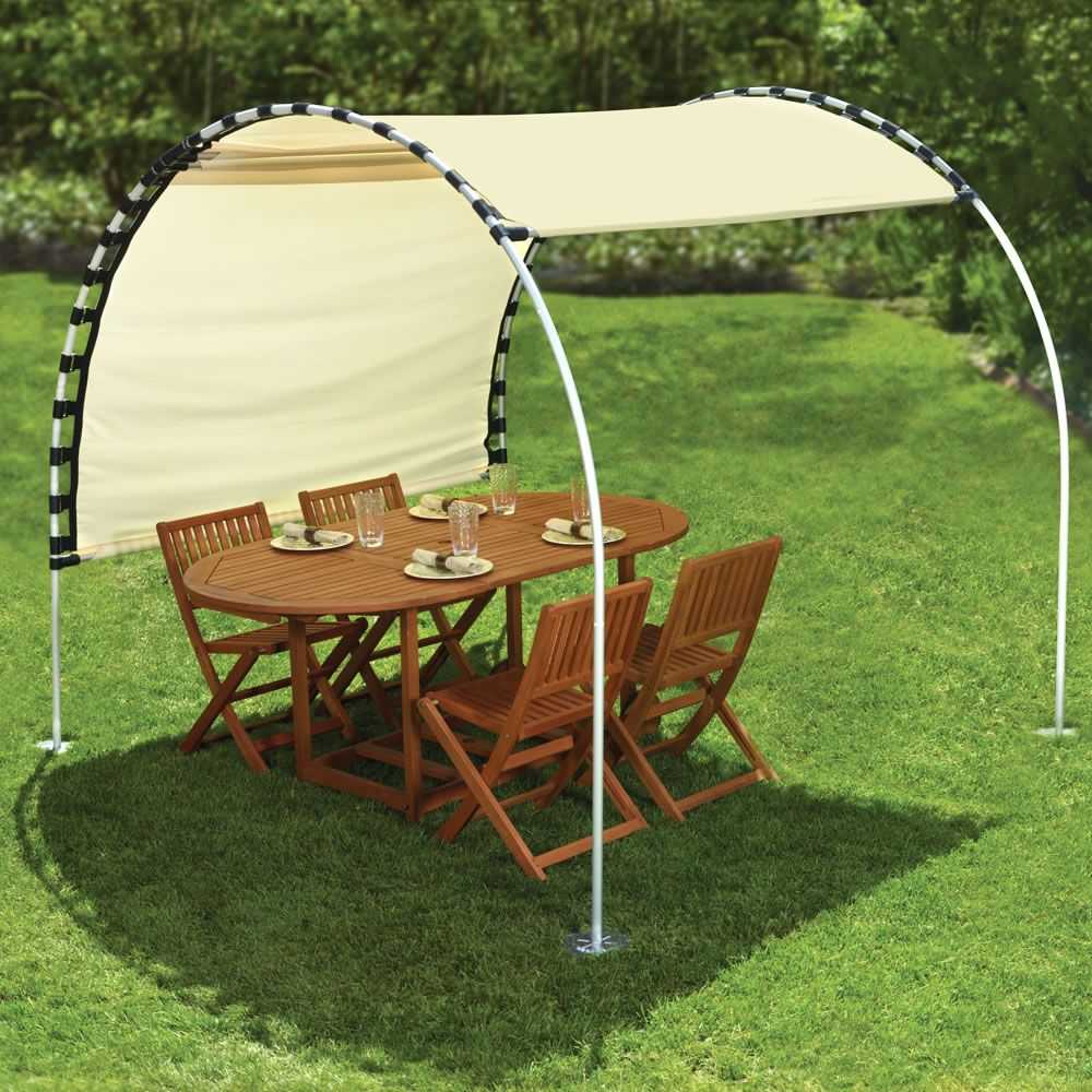 Пергольные беседки выглядят очень красиво, дают тень, но подходят только для сухих дней. К тому же ткань придется часто стирать, ведь темный цвет для них использовать не принято.