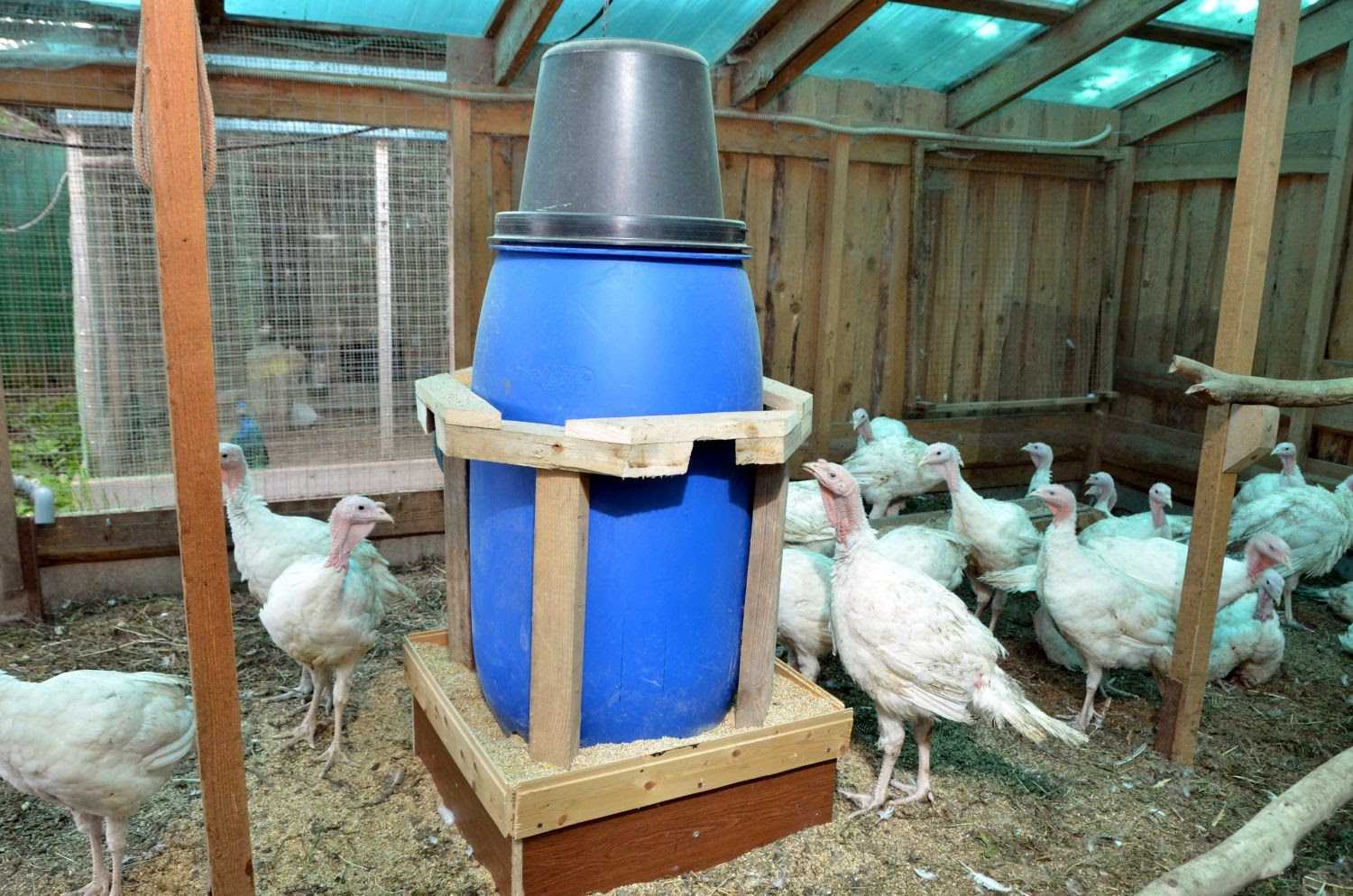 При выборе того или иного варианта учитывают габариты птицы и их рост. Кормушки располагают на уровне спинного отдела индюков. Для более рационального использования необходимо насыпать корм в емкость на 1/3 от общей высоты.