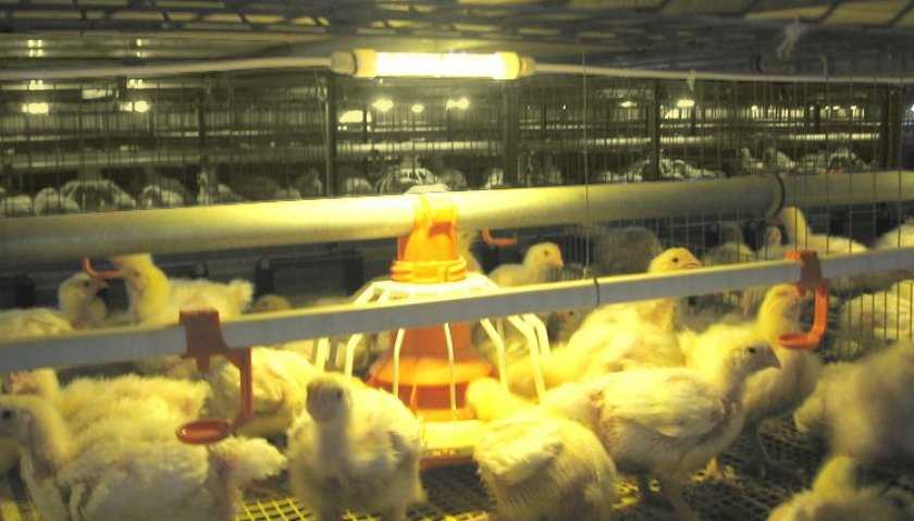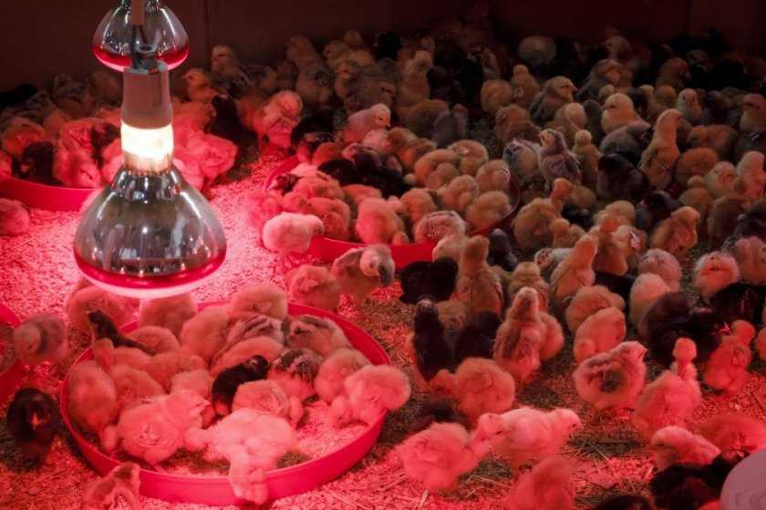 - непереносимость световых частиц птенцами провоцирует образование неприятного запаха на подстилке — в местах, где цыплята прячутся от света лампы.