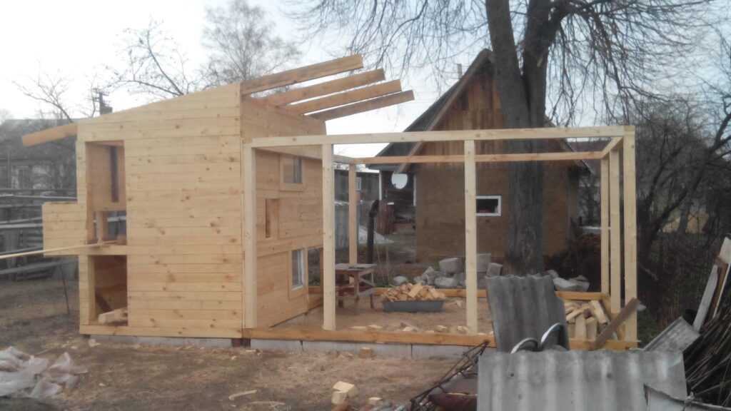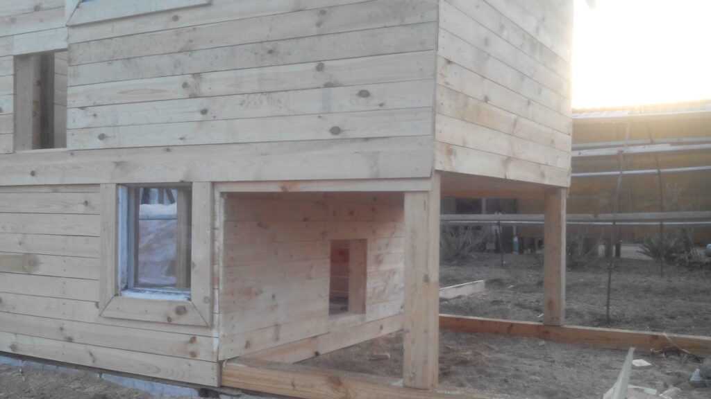Так же на фото видим, что брусья длиннее чем сам курятник – это место для гнезд.