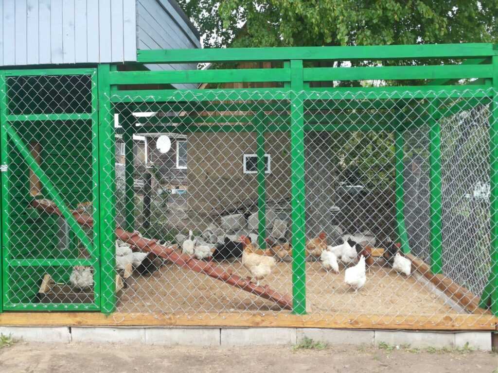 Обычное помещение для кур имеет вид сарая с площадкой для выгула птицы. Место для прогулок ограждается сеткой рабицей или ей подобной, что исключает проникновение котов и собак, а также позволяет контролировать местонахождение кур.