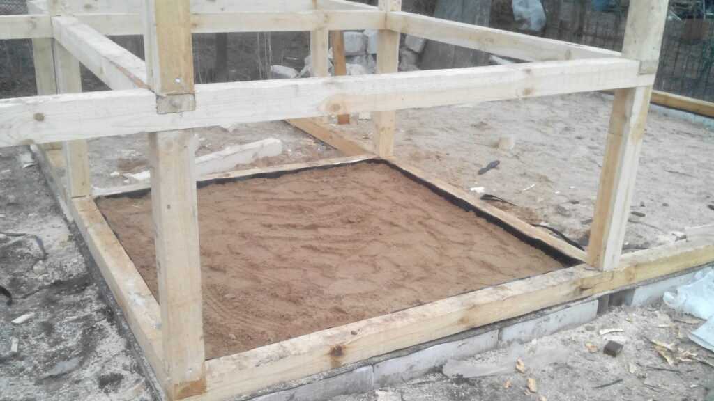 Выравниваем площадь курятника песком.