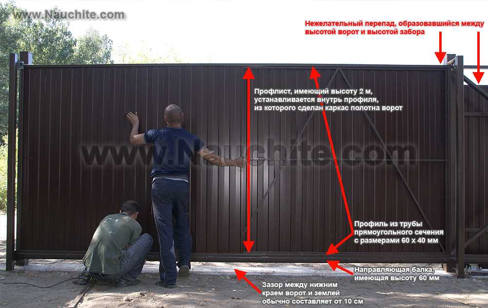 Идем дальше. В отличие от забора, профлист ворот обычно вставляется в профиль, из которого состоит каркас полотна ворот, при этом профиль обычно сваривается из трубы прямоугольного сечения 60/40 мм. Уже набежала высота ворот: 100мм + 40мм + 2000мм + 40мм = 2180мм. Но это ещё не всё, так как к полотну ворот снизу приваривается направляющая балка, имеющая высоту 60 мм (для ворот массой до 350 кг). Итого, с учетом направляющей балки, расстояние от поверхности земли до верхнего края ворот уже составляет 2180 мм + 60 мм = 2240 мм. Как видите, согласно расчетам, верхний край ворот оказался на 24 см выше верхнего края забора!