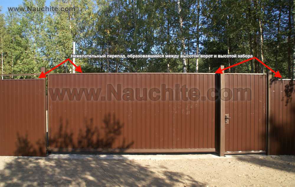Многим может показаться, что данный момент вообще не стоит внимания и обсуждения, но это не так. Отчасти согласимся. Действительно, игнорирование данного момента не создаст Вам никаких существенных проблем кроме эстетических. Многие считают, что если высота полотна забора, примыкающего к воротам составляет 2 метра, то и высота полотна ворот должна быть 2 метра. В реалии это не так. Давайте рассмотрим на примере: