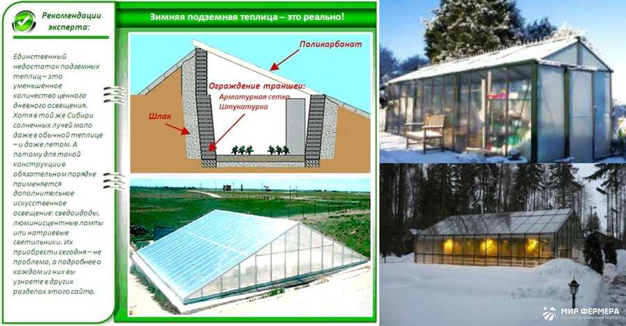 Все зимние постройки данного типа отапливаются: энергией солнца, техническими средствами, биотопливом. Они могут быть как углубленными в грунт, так и построенными на его поверхности. Их конструкция разнообразна: от односкатных до арочных.