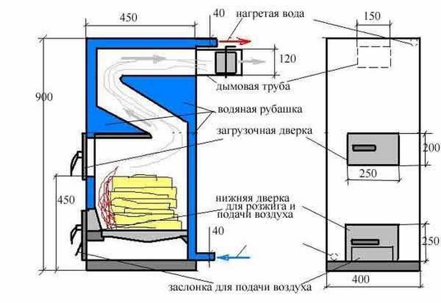 По конструкции они бывают вертикальными и горизонтальными. Дровами удобнее топить горизонтальную — более длинные поленья влезают. Делать проще вытянутую вверх, но топка при этом имеет небольшие размеры, придется дрова пилить мелко.