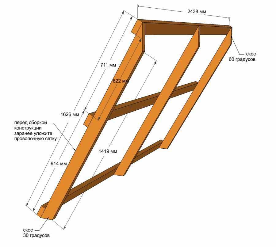 Чертеж курятника совсем простой, напоминает вытянутую треугольную пирамиду. Начинать работу нужно со сбора каркаса: