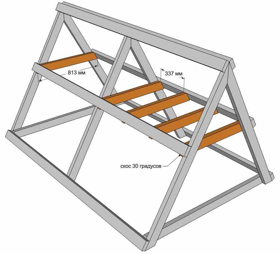 - Для устройства каркаса из деревянных брусков сечением 20х40 мм сооружают две треугольные рамы;