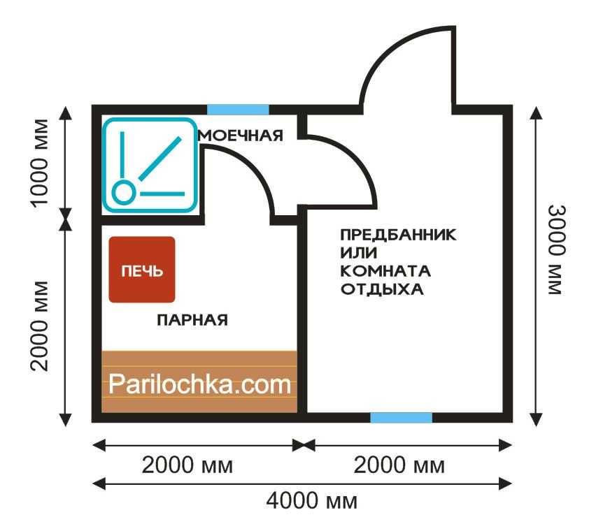 Опять же, заметьте, что при желании вы легко увеличите размеры парной за счет ширины комнаты отдыха. Если она — не более, чем предбанник, смело сокращайте ее размеры, чтобы выиграть в габаритах парной и моечной.