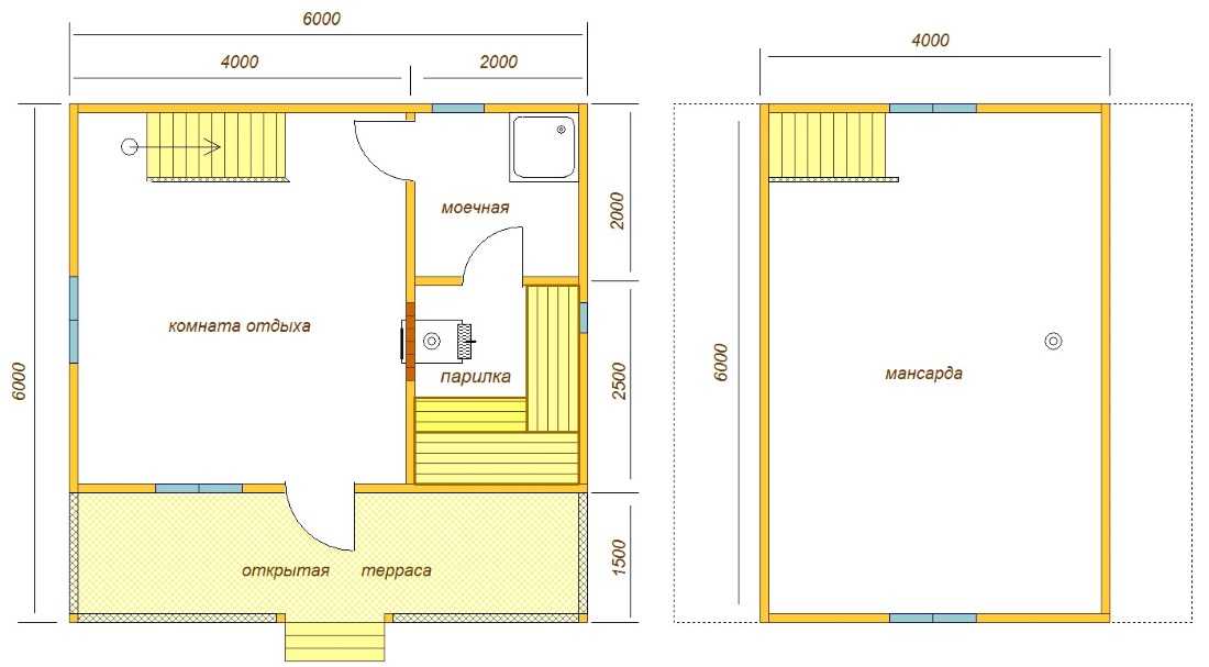 Планировка двухэтажного дома бани 6х6 позволяет жить летом или круглый год. Такой проект имеет преимущества в плане экономии. Например, мансарда помогает визуально увеличить подсобные комнаты в бане, такие как парилка, раздевалка и душ. Это необходимо в том случае, когда предполагается, что там будут находиться несколько человек сразу.