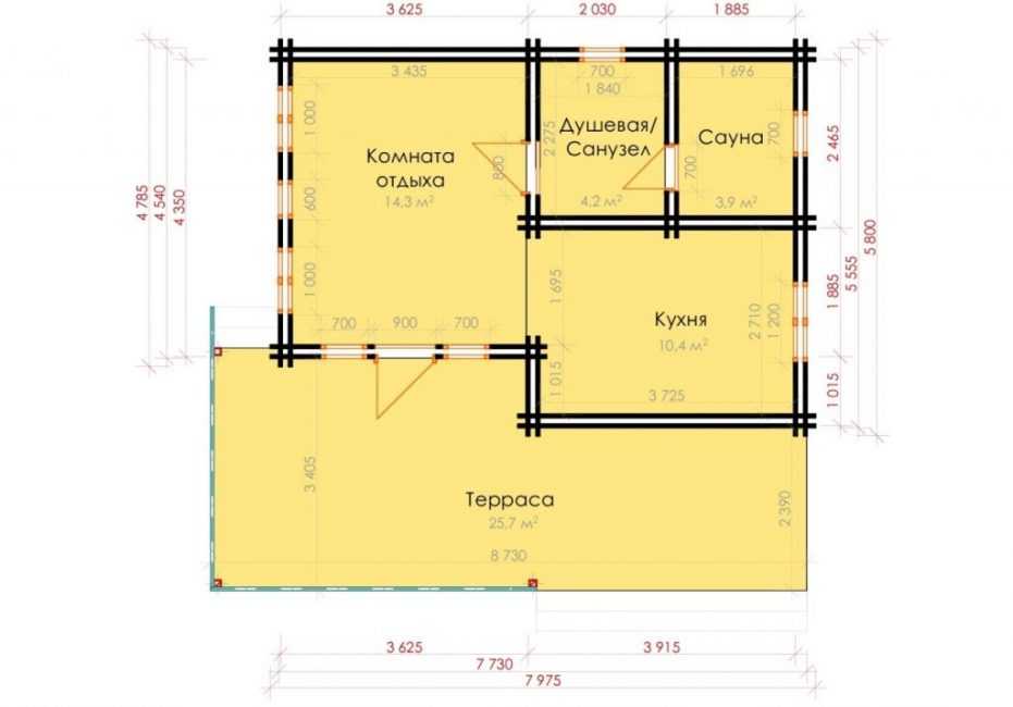 - Проект парилки или сауны в бане – самый важный. Если площадь здания позволяет, организуют и другие помещения.
