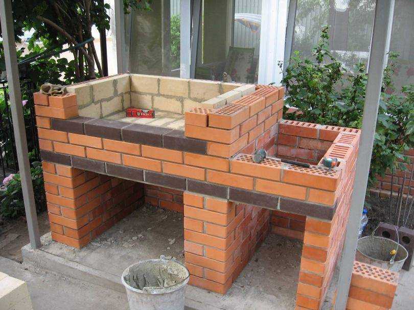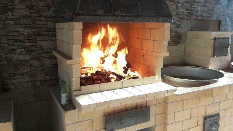Небольшие щели, оставленные при кладке, способствуют лучшему горению ввиду проникновения большего количества кислорода. Если решено сделать место для барбекю, то для решетки делаются выступы, а в прослойки вставляется арматура.