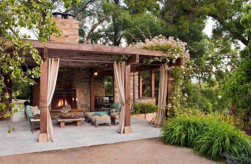 - Открытые – имеет опорные металлические или деревянные стойки, крышу. Стен нет, их заменяют шторы или вьющиеся культуры. Внутри конструкции может быть мангал или барбекю.