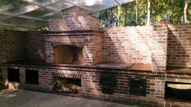 Затем устанавливают дверцы коптильни, заканчивают кладку арок над мангалом, плитой для варки и печкой. После выполняют расшивку швов. Над плиткой можно закрепить сетку из нержавейки. Она пригодится для посуды, сушки ягод, грибов. Останется зашить кровлю, подвести воду к мойке и положить напольное покрытие. Для устойчивой тяги трубу лучше делать трехканальной.