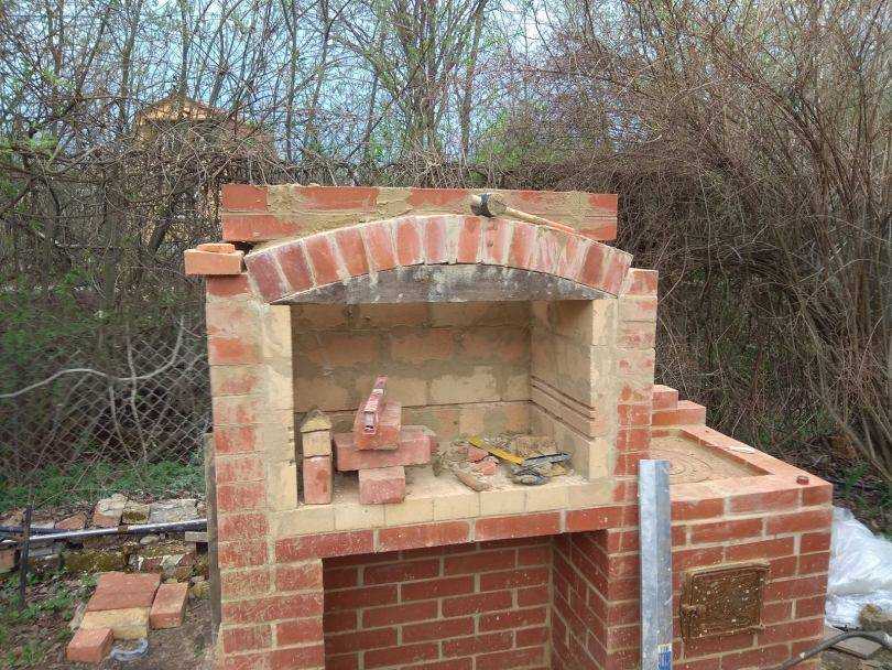По желанию делают нишу для посуды. Для казана понадобится плита. Это может быть вариант со съемными кольцами. После изготовления основания для барбекю выкладывают столешницу из шамотного кирпича. Дальше организуют дымоход и формируют канал для коптильни, ряды армируют проволокой. Затем занимаются печным сводом, выкладывая стены и одновременно проверяя их посредством уровня. При этом задняя стенка может быть выдвинута за пределы контура.