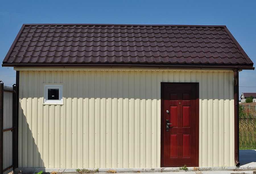 Сарай из профилированной трубы (сборка на косынках и уголках) с обшивкой и кровлей из профнастила, без утепления, на бетонированной площадке