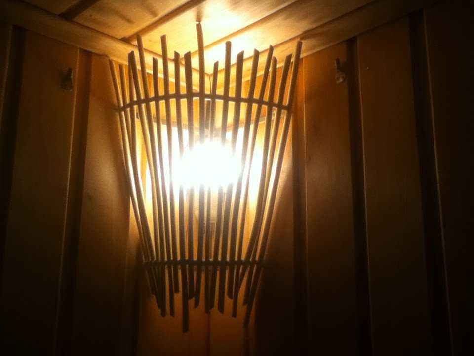 Поверх основы на шурупы, саморезы и/или мелкие гвозди крепятся деревянные рейки. Их можно расположить под углом, вертикально и т. п. Если проявить фантазию, получится стильное бра, которое украсит интерьер банного помещения.