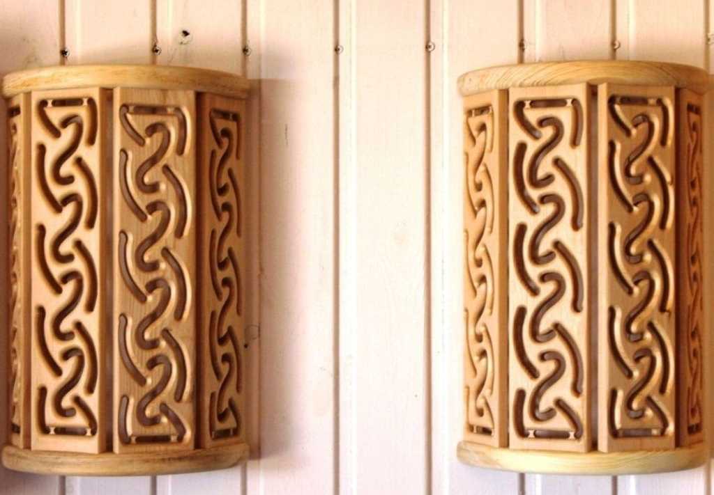 Большинство бань, расположенных на приусадебных участках, впрочем, как и саун внутри загородных домов, отделаны деревом – чаще всего вагонкой из различных пород древесины. В этом случае хочется дополнить интерьер натуральными элементами, чтобы соблюсти целостность картины. Поэтому декорирование светильников деревянными решетками имеет не только практическое, но и эстетическое значение.