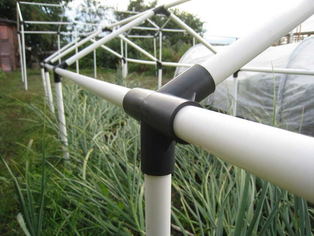 Намного проще использовать легкие ПВХ-трубы. Они дешевле, проще в монтаже и позволяют придавать теплице любую форму. Для соединения труб между собой и формирования основания, можно использовать сварку с фитинговыми соединениями, шурупы или клей.