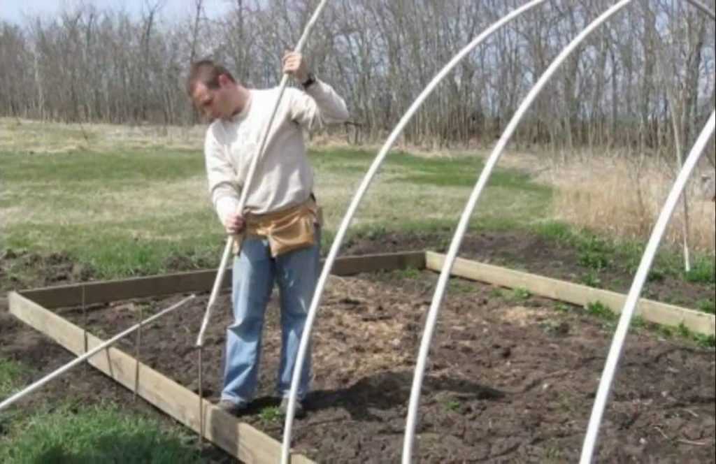 Пример, как собирается теплица из пластиковых труб своими руками, фото крепления дуг к основанию