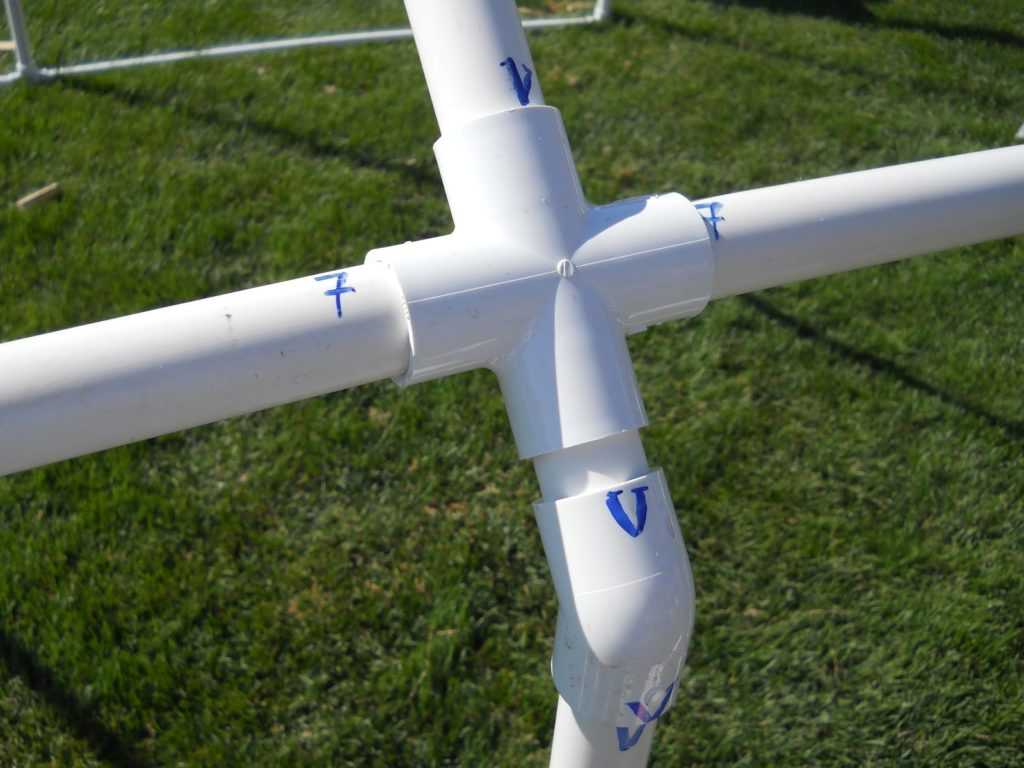 Далее потребуется труба пвх длиной равной длине арки теплицы. На нее надеваем тройники, расстояние между ними должно быть равно ширине проема. Закрепляем проем на тройниках.