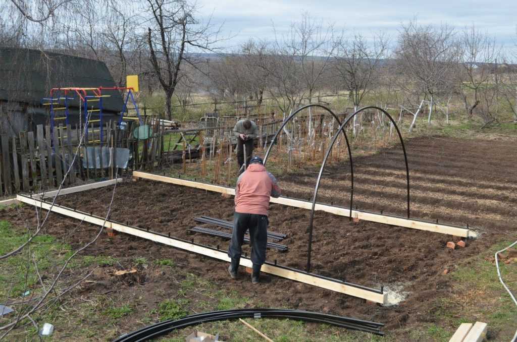 Самым простым является грунтовый парник. Справиться с его закладкой сможет даже женщина. Для обустройства выбирают место для будущей рассады, готовят грядку и на одинаковом расстоянии друг от друга располагают полипропиленовые трубы, сгибая их в виде арок.