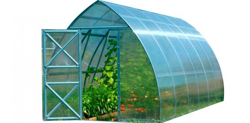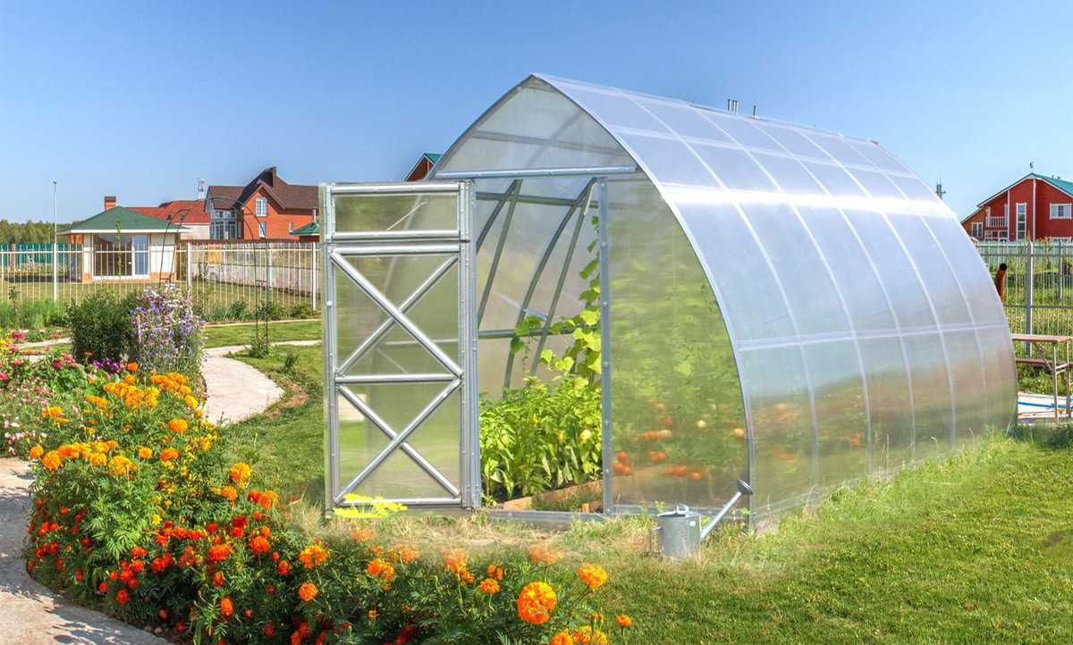 Сверху теплицы покрывают поликарбонатом. Этот долговечный, прочный материал создаёт оптимальные условия для роста и развития растений. Сеять семена и высаживать рассаду можно на месяц раньше обычного. Осенью продолжительность сбора урожая также увеличивается.