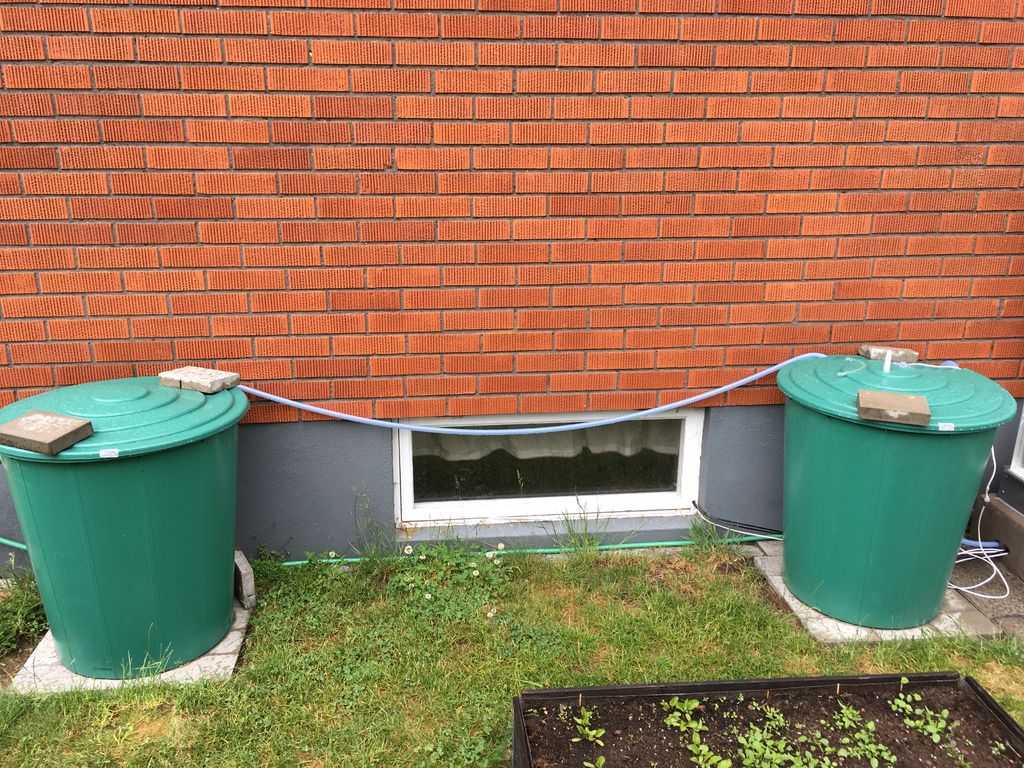 У меня есть два бака для сбора дождевой воды, подсоединенные к водостоку. В баках установлена автоматическая защита от перелива, требующая выставления уровня наполненности. Баки соединены между собой шлангом, таким образом, между ними осуществляется сифонный водосброс, чтобы достичь одинакового уровня воды в обоих баках.
