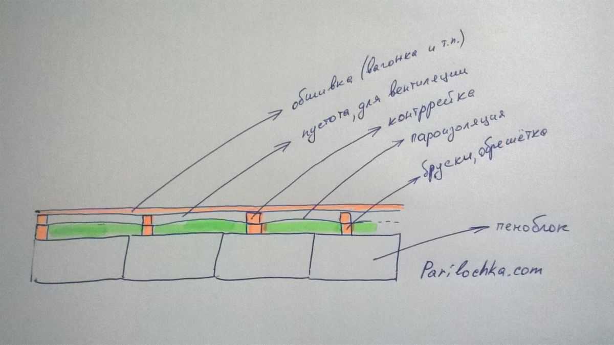 Понятно, что для бревенчатых и брусовых парилок приходится уделять внимание заделке и зачеканке межвенцовых стыков, иначе через щели и трещины внутрь бани будет попадать большое количество влаги и влажного воздуха. Аналогичным способом можно построить утепление в парилке, сложенной из шлакоблока. При этом несущий брус обрешетки можно уложить горизонтально