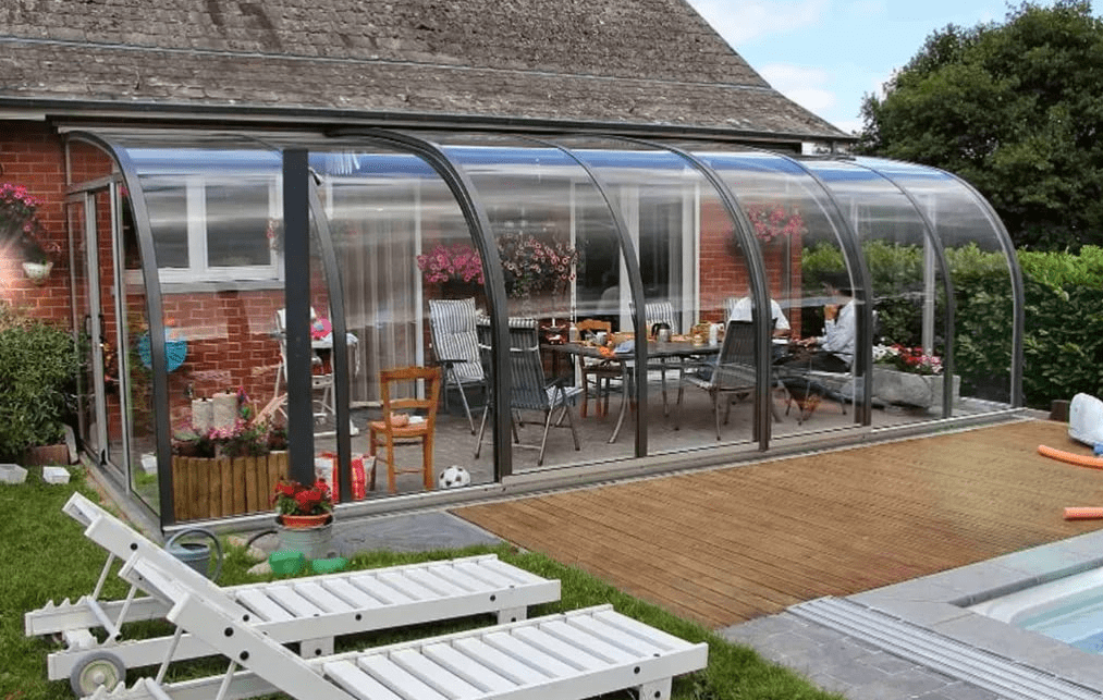 Чтобы решить вопрос духоты внутри, можно выполнить конструкцию крытого типа с использованием стеклянных штор. Конечно, такие сооружения не будут теплыми, как беседки из камня или кирпича, однако, для теплых регионов они вполне подойдут. К тому же открытие стеклянной двери-шторы позволяет при необходимости сделать из закрытой беседки аналог полузакрытого типа. Такая беседка будет светлой, а если оклеить стекла специальной пленкой, она будет защищена от радиации и скроет от любопытных глаз все, что происходит внутри. При этом пленка весьма уникальная: изнутри вид на улицу не будет ограничен.