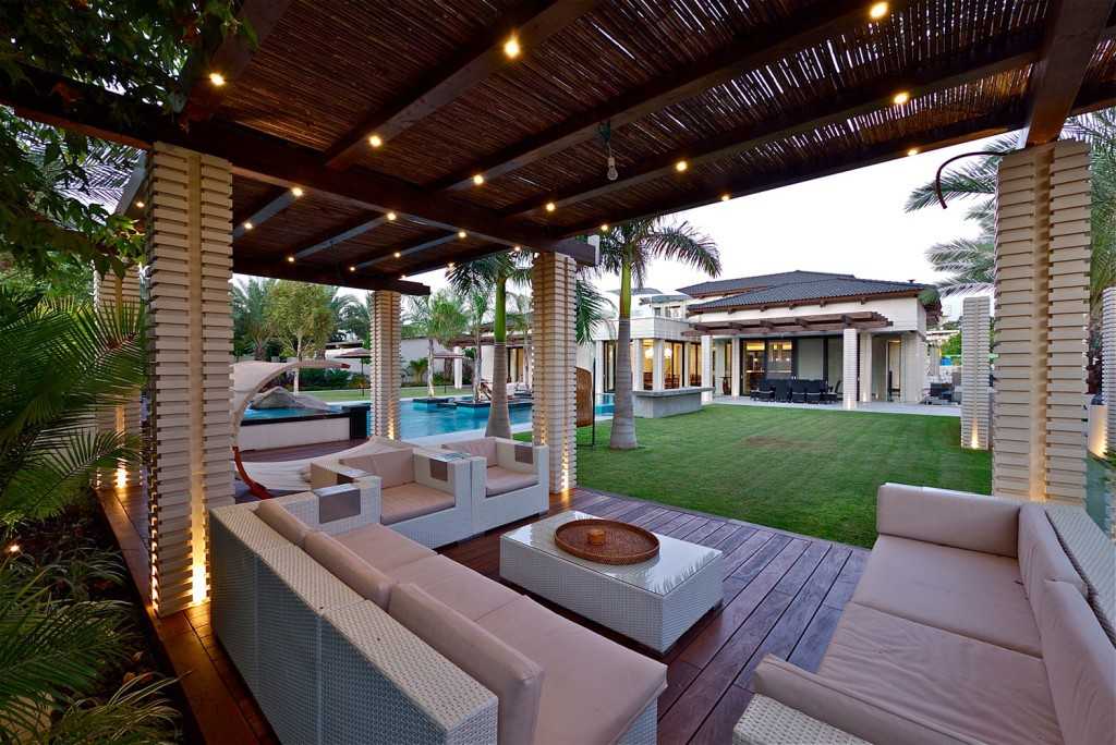 Атмосфера уютной гостиной воссоздана в небольшой беседке благодаря разнообразному освещению – подвесная люстра, настенные светильники и напольные бра создают романтическое настроение.