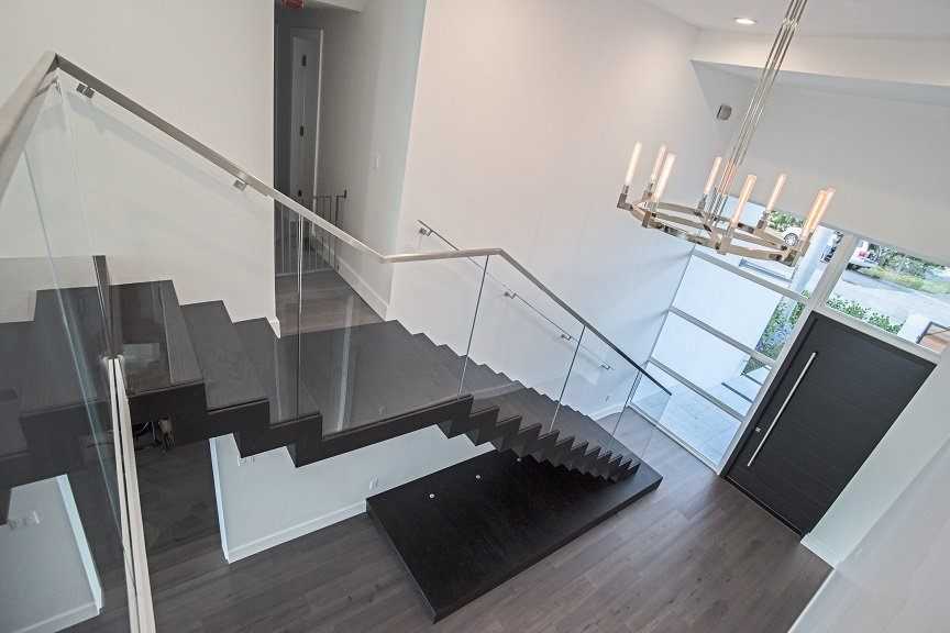 Усиленное стекло используют чаще в современной стилистике. Этот материал отличается способностью визуально изменять пространство. Вместе с ощущением легкости такие конструкции визуально делают помещение больше. Например, оно удачно смотрится в интерьере хай-тек. Стекло гармонично сочетается с металлом (модерн). Такие конструкции смотрятся стильно.