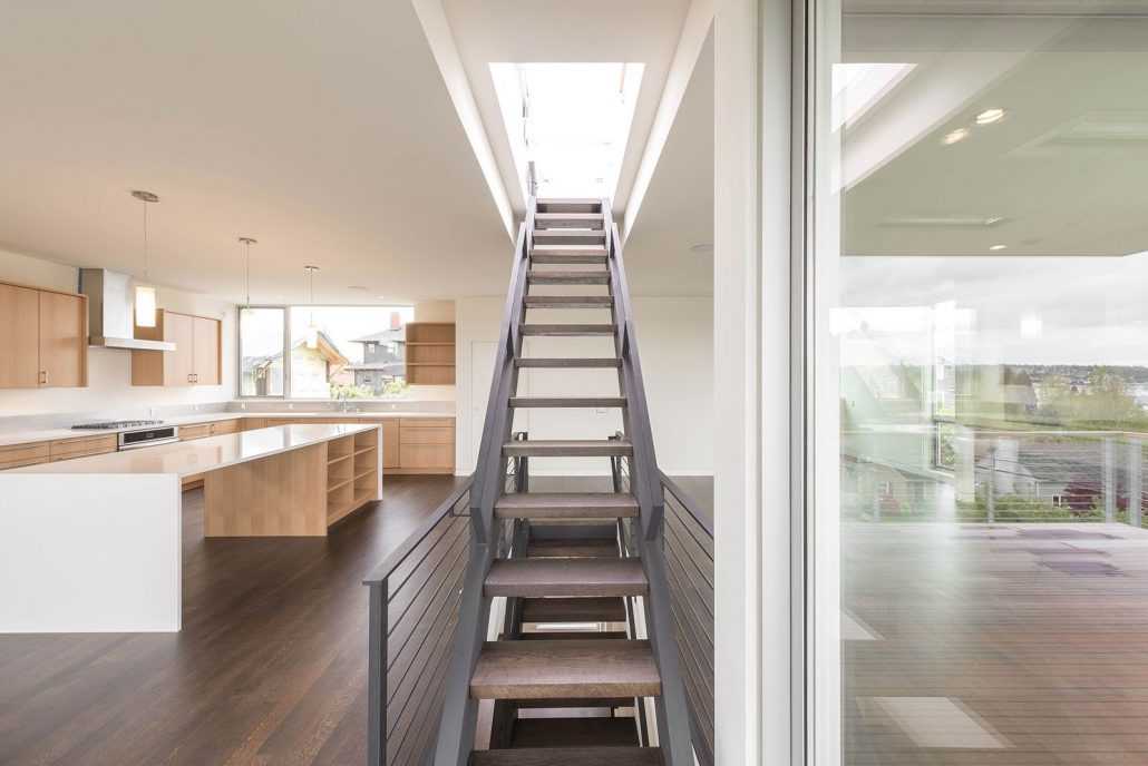 Благодаря подбору оттенков отделки, кухня с лестницей наверх в частном доме может смотреться элегантно и одновременно уютно.