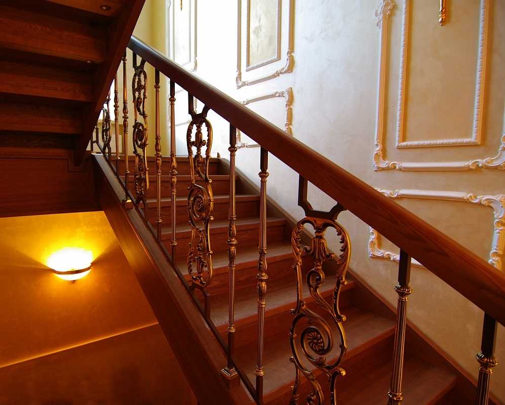 Нередко традиционные материалы выполняют декоративную роль в дизайне лестниц. Использование ажурной ковки для ограждений позволяет придать конструкции прочность, надежность и уникальный стиль. Для этого используют чугун, латунь, бронзу. Дерево вносит в дизайн русский колорит. Использование мрамора придает лестнице определенный статус.