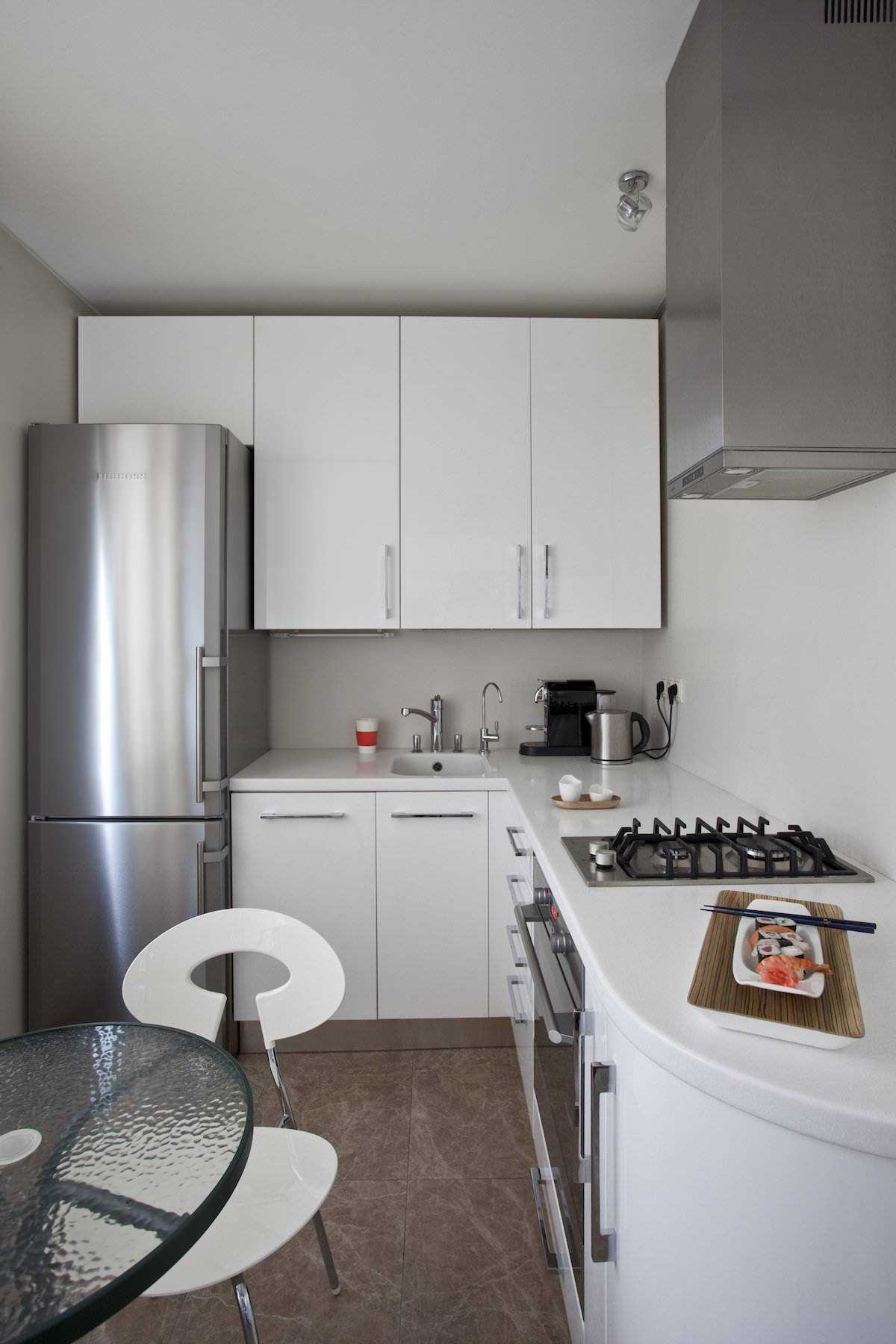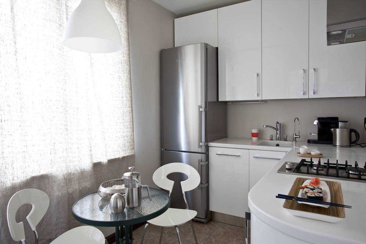 Не всем удобно, когда кухня находится в жилом помещении, поэтому многие владельцы хрущёвок предпочитают иметь небольшое, но отдельное место для готовки и приёма пищи. Тесная кухня обустраивается компактной или складной мебелью, высокими и вместительными настенными шкафами с глянцевыми фасадами, а также зеркалами, увеличивающими пространство и свет.