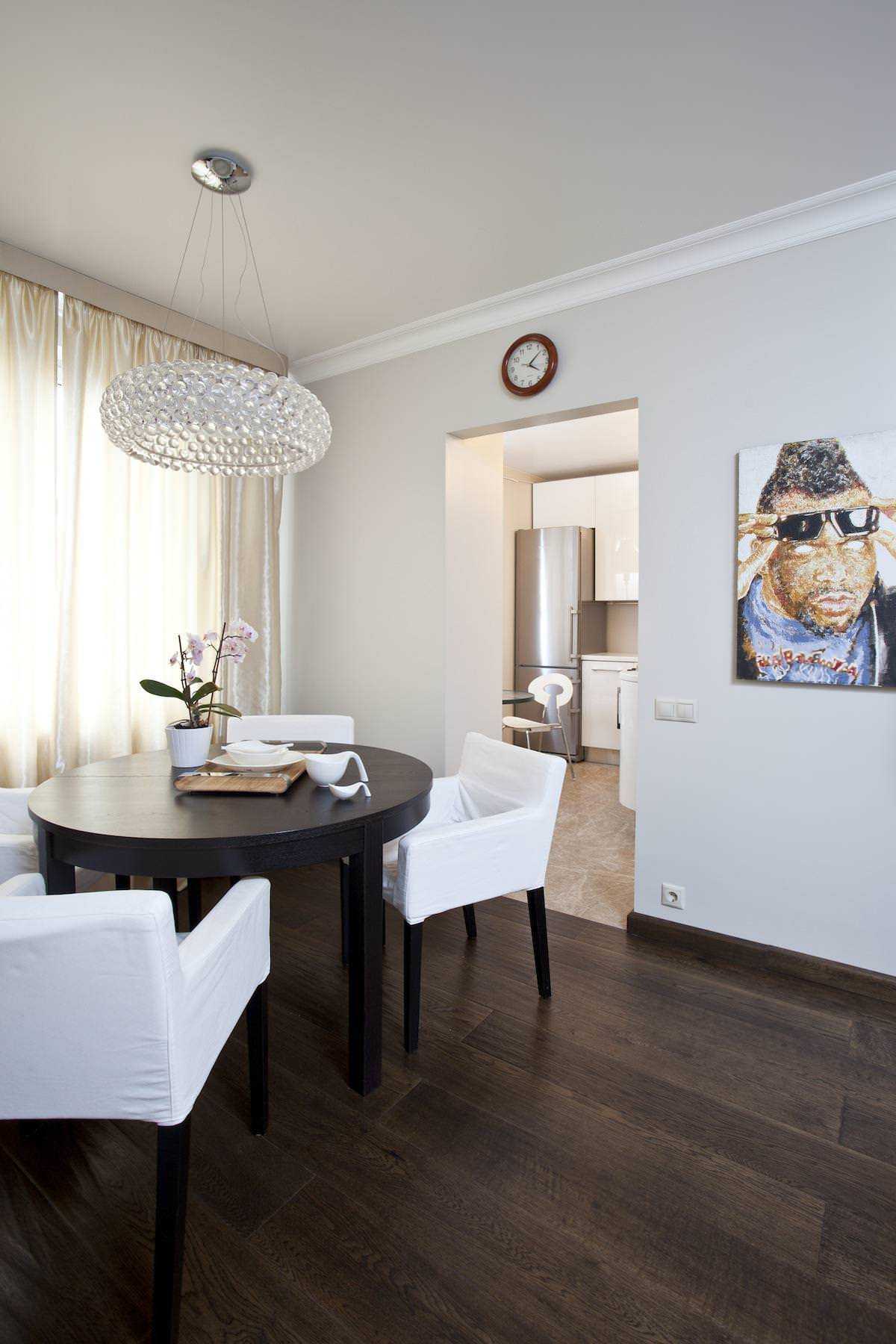Современный дизайн интерьера не предусматривает нагромождение мебели и других аксессуаров, поэтому в столовой все в минималистическом стиле – круглый стол и четыре мягких стула, оформленных в белые чехлы.