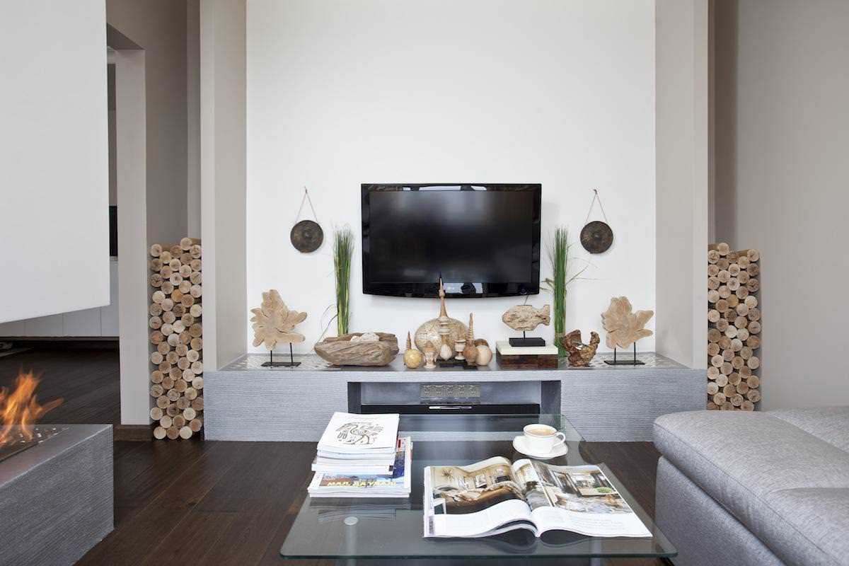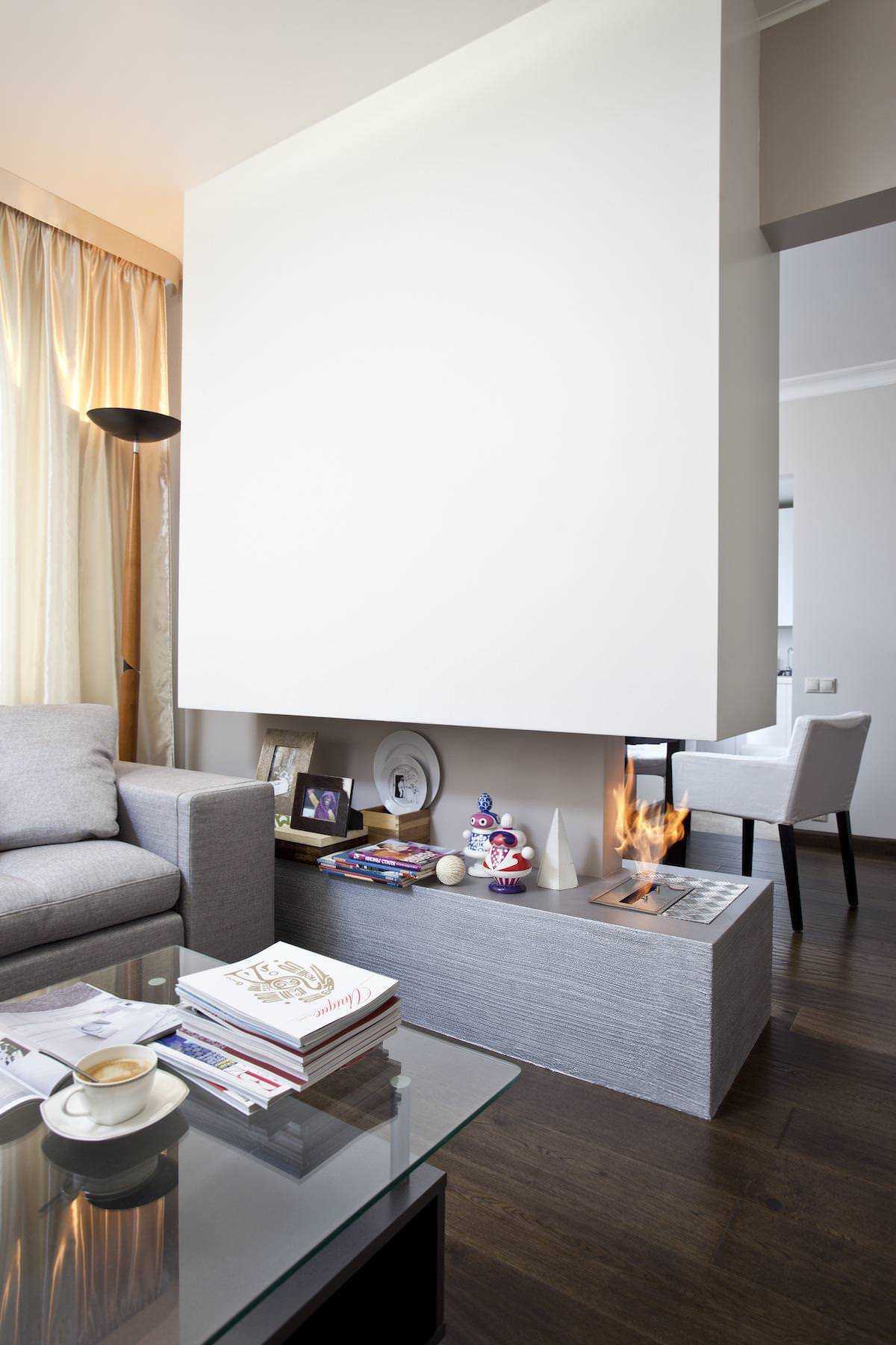 - обустроили камин на биотопливе, при этом для декора рядом положили настоящие дрова.