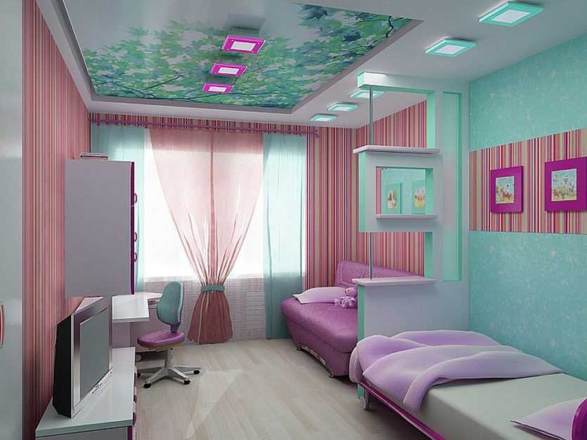 Романтичные натуры могут сделать потолок нежно-голубого цвета, либо темного со множеством звезд. Крупных принтов на потолке лучше избегать.