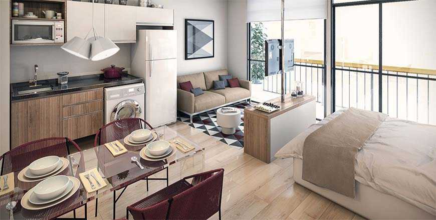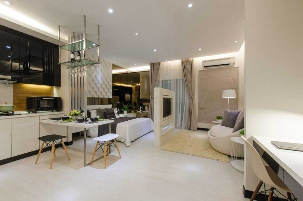 Отличительной особенностью архитектуры новостроек является проектирование квартир-студий. Студия представляет собой свободное пространство с кухней, входящей в жилую зону, и отделенный санузел. При создании дизайна маленькой квартиры (например, площадью 17 кв. м) предпочтение лучше отдать открытой планировке. Переход от кухонной зоны к гостиной следует сделать плавным. При планировании стиля студии дизайнеры советуют отдавать предпочтение встроенной технике, чтобы придать жилищу аккуратность и разгрузить пространство.