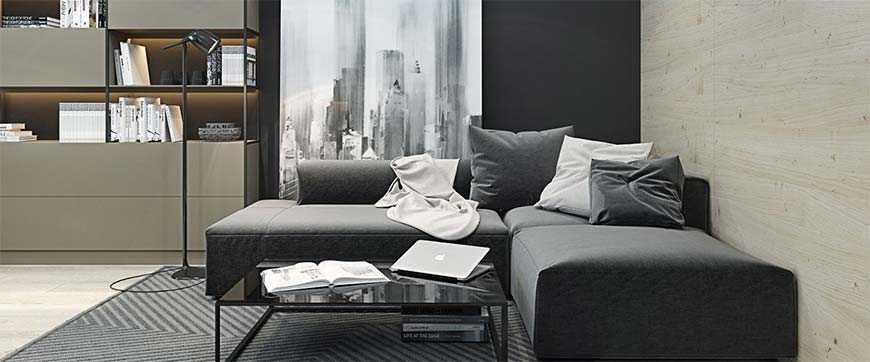 Для обустройства зала выбирают только самую необходимую меблировку, в виде дивана, журнального столика и различных систем хранения. Рациональное решение представляют собой угловые конструкции, эффективно использующие неактивное пространство и сохраняющие место для перемещения в комнате.