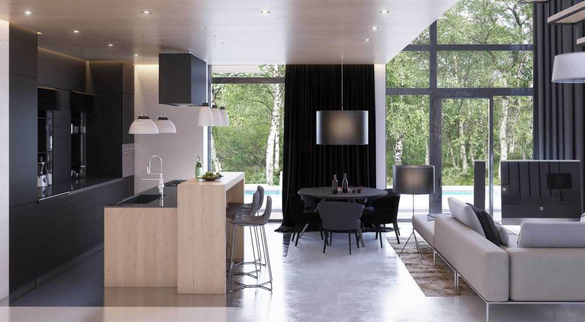 Гастрономические запахи не ограничиваются пределами кухни и могут беспрепятственно распространяться по всей квартире. Поэтому подходить к выбору мебели и материалов, из которых она выполнена, нужно более тщательно. Мощная вытяжка, установленная в кухонной зоне, позволит защитить пространство квартиры от ароматов.