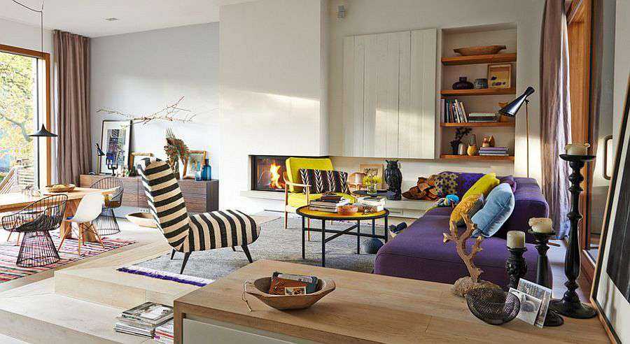 Внутри дом в скандинавском стиле (фото ярко это демонстрируют) представляет собой свободное и светлое пространство, от которого веет чистотой и уютом. Интересным сочетанием могут стать фрагменты контрастного черного или темно-серого оттенка на белом фоне. Прекрасно дополнят интерьер детали ярко-желтого цвета.